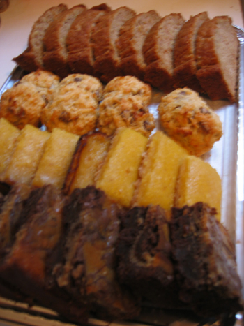 Peanut butter marbled brownies, lemon bars (made the crust myself, hee hee), coconut macaroons with chocolate chips, and zucchini bread.. mmm..