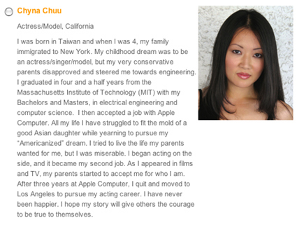 4.13.06I am trying to become the 2006 face of East West magazine!![]() [East West] is a nationally distributed magazine that has a contest every year for one reader to be on the cover of their December issue. I had to submit my picture, and a 100 word essay on why I am the combination of East and West about three weeks ago. I got selected as one of 30 semifinalists! The five finalists will be picked via ONLINE VOTING ALONE!!! So I need your help to register and cast a vote for me! One vote per person (no limit on IP addresses). 1. Go to http://www.eastwestmagazine.com ![]() 2. Click on the "Register to learn more.." and register for an account (you need to put a valid email) 3. Check your email and click on the activation link 4. Login and vote for me! ![]() Since it's just based on online voting, the top five finalists will be the ones with the most friends and family, so I need to try to get as many votes as I can! Please tell your friends and family to vote! The final winner will be picked by a panel of judges in the industry to be on the cover and have a spread in their magazine!! Thanks everyone!!!!4.8.06 I've been selected as one of 30 semifinalists to be the face of East West magazine! The five finalists will be selected via online voting. Online voting starts April 13, so check back for the link! 4.3.06 I received numerous offers and finally decided to sign with CESD, the top commercial/VO/modeling agency in the city! 3.28.06 I got my second SAG voucher! I was selected to play a geisha on CSI:Crime Scene Investigation! 3.23.06 I got my first SAG voucher! I was picture-picked by the director Joe Caragan of the pilot "Faceless" to be in a scene with Sean Bean! I'm such a big fan of him, it was so exciting! 3.14.06 I booked a Bank of the West commercial! Almost all of the other people who auditioned were submitted by their agents, but I got the part! Woo hoo! 3.13.06 I wrapped on 6 days of shooting for my lead role in "Fortune Cookie Connection." I can't wait to see it! 3.8.06 I did my print job for Eagle Eyes sunglasses today with photographer Ron Finley. He's an accomplished photographer who has done over a thousand TV and print ads for national clients. He asked me if I did a lot of print, because I was really good at it. The client also wanted to have me model more sunglass frames than planned because they thought I did a great job as well. I've posted one of the pictures in my portfolio. 3.4.06 I had an audition for an hosting show on Imaginasian. The producer said she remembered me from an audition about a year ago and she remembered I did a good job. I hope I get it! 3.1.06 Next Wednesday I am booked for a print job modeling some eyewear. I love print jobs that are triple-digits per hour. 2.27.06 I've been working background to try to get my SAG vouchers. I was on the set of CSI: Miami, and David Caruso was walking back from set, and I avoided making eye contact because some stars don't like that. Then I saw him walking towards me, and then he said, "Hey, how are you doing?" I said, "I'm doing good, you?" He said, "Are you cold? Can't they get you another jacket or something?" I said, "No, that's okay. I'll just bounce around to stay warm." Then he proceeded to tell me about the nearby buildings and how they were all going to be torn down to build high-rise buildings and lofts. Then he said, "Are you sure you're not cold? I'll get you my jacket." I said, "No that's okay! Thank you so much though!" Then he walked to back to his trailer. He comes back two minutes later with a jacket, and gives it to me. What a nice guy! 2.26.06 I got another lead role for a student thesis film called "The Arrangement"! I love the script, and I'm really excited about it. It shoots beginning of March. |